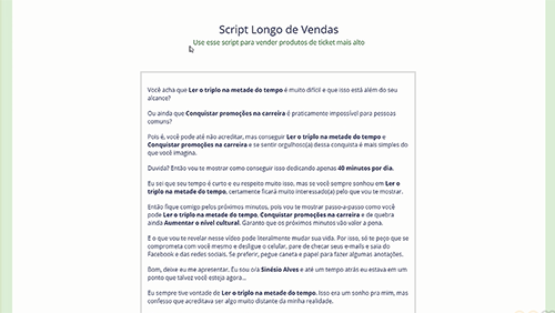 São 11 módulos, sendo 4 módulos teóricos completos sobre Copywriting e 7 módulos com um software capaz de criar TODOS os scripts de Copy que você precisa para seu negócio.